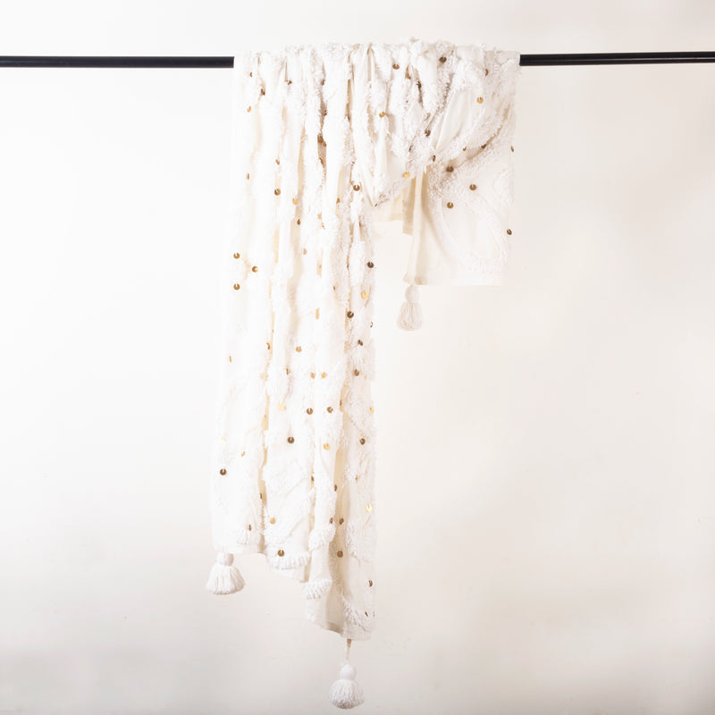 Unique, handmade, boho chic throw blankets made by our team of weavers in India. These are hand tufted with beautiful designs. The tassels & sequin are sewn in the end to finish the throw. Tassels on all 4 sides of the throw