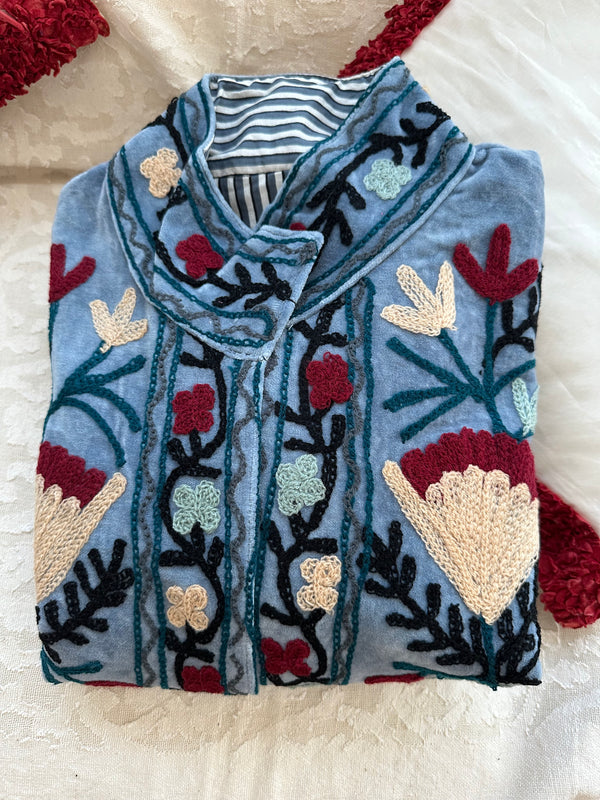 Add timeless elegance to your wardrobe with our hand-embroidered velvet jacket, crafted by skilled artisans using age-old embroidery techniques.